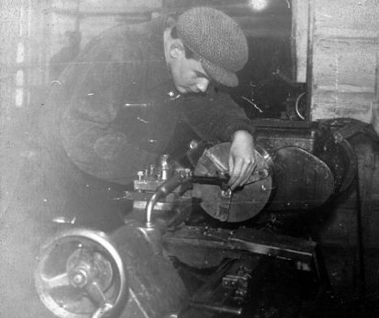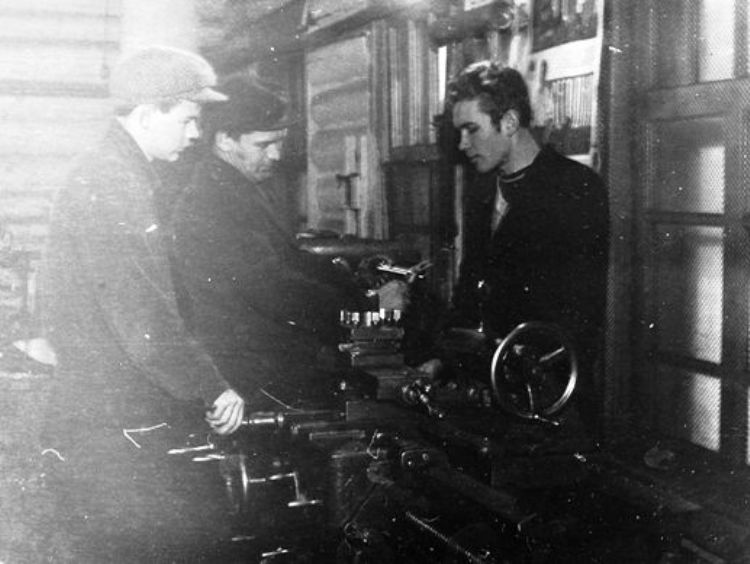 Под руководством Бутенко Антона Петровича мы учились токарному делу. Евгений Лубнин и Валерий Лысков учатся токарному мастерству, изучают станок ДИП-200 (1960 год)